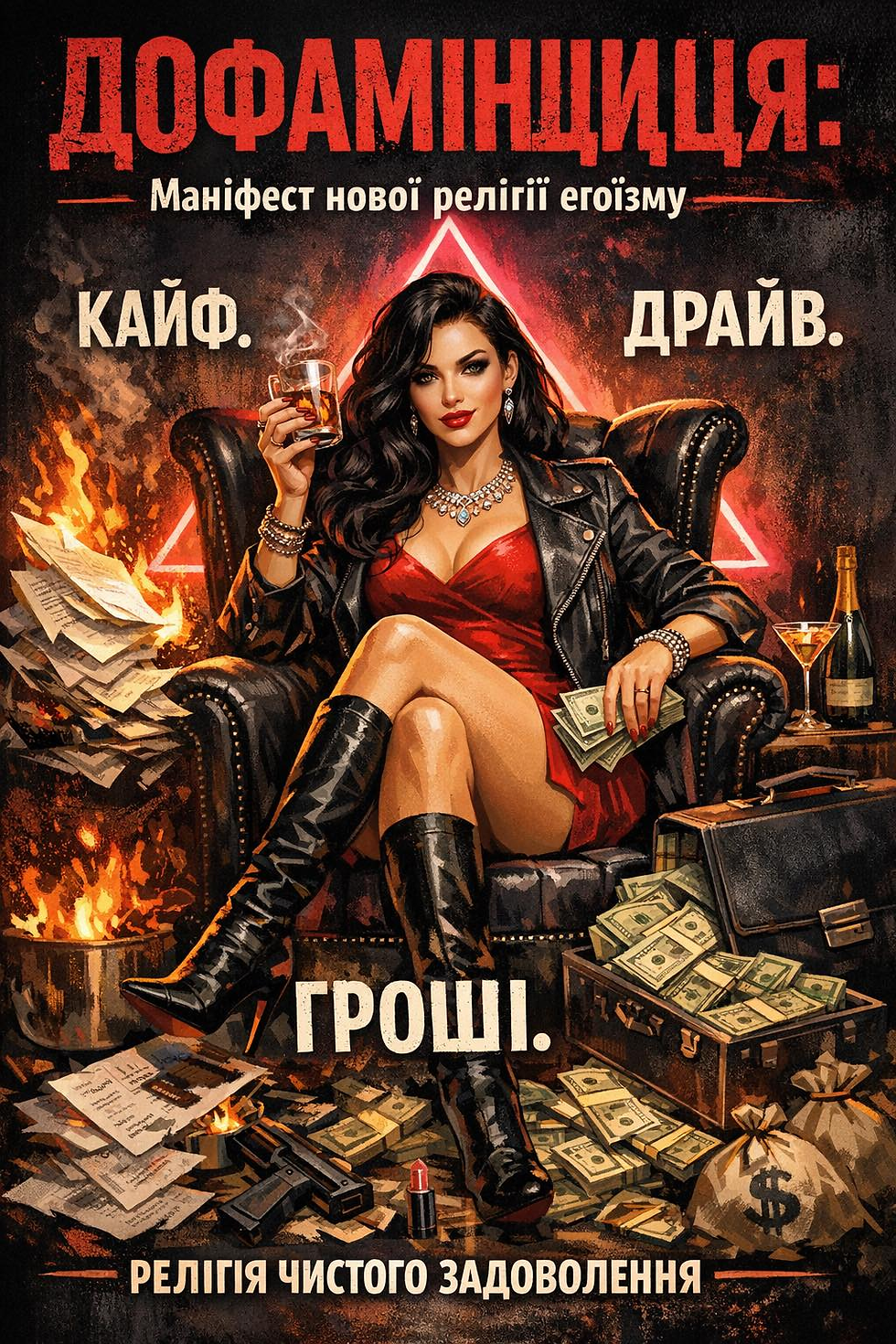 На сцену виходить Дофамінщиця. Жінка, чий світ обертається навколо трьох китів: Кайф. Драйв. Гроші. - Релігія чистого задоволення
